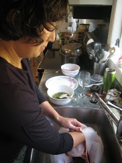 That turkey likes to pretend that he was all innocent and that I was the bad guy. But look at my face! Ewwwwwwwwww! I might be shoving my entire hand inside that bird, but I took no pleasure from it.